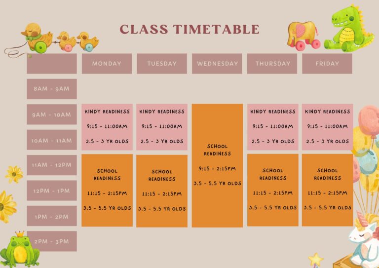 Kindy Readiness classes are run as a package of 2 x 1hr 45min classes each week during the term: